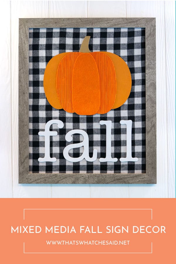 I paired a buffalo check fabric background with chipboard letters and added a pumpkin layered with cardstock, corrugated cardboard and felt! This easy mixed media sign will be your new favorite piece of fall decor!