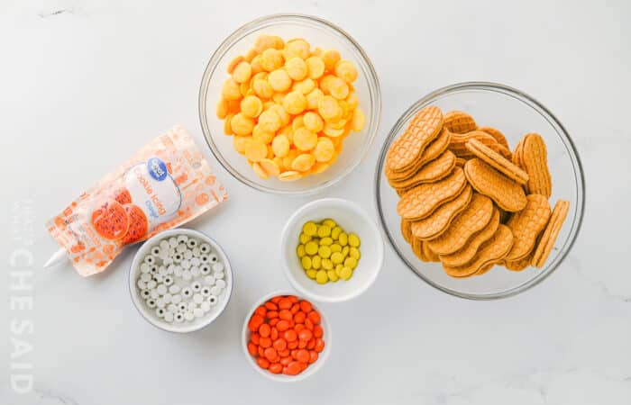 - Prep the Candy Pieces – Carefully cut the Reese’s Pieces in half using a sharp knife. The orange pieces are beaks and feet and the yellow pieces are for the wings.