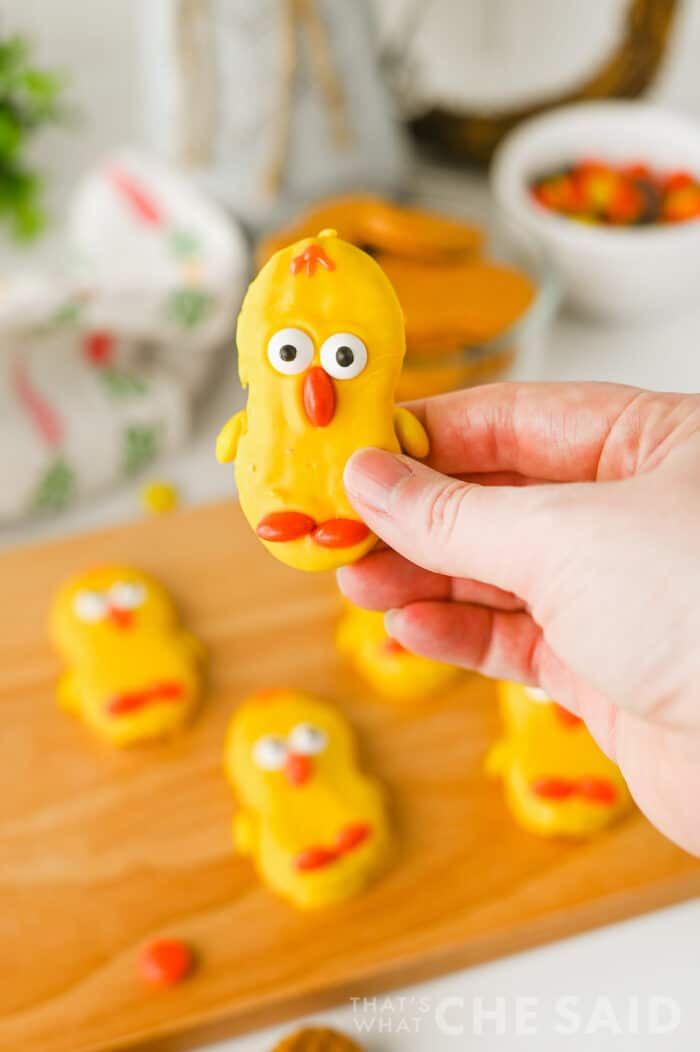 - Decorate Quickly – working in small batches, before the coating sets, add 2 candy eyes, 1 orange beak, 2 orange feet and 2 yellow wings.
